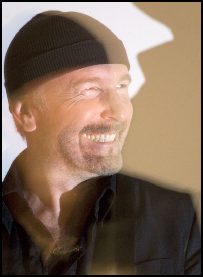 Edge's lips curl into a smile, clearly reveling in the sheer joy of the moment.